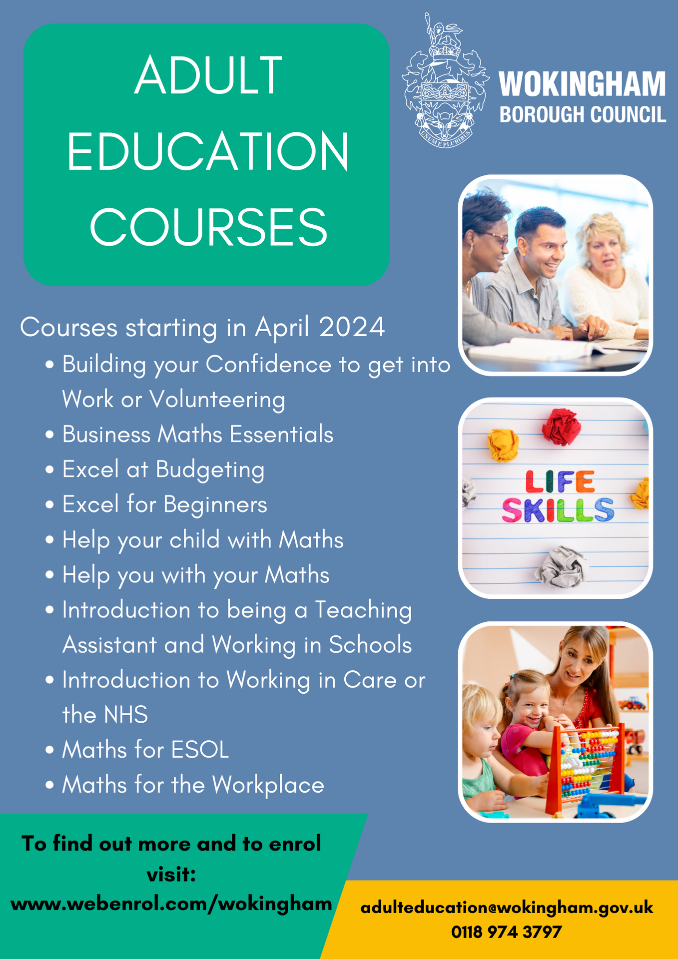 To be eligible for Adult Education courses, you need to: Live or work within the Wokingham Borough, or have a child attending a Wokingham school,