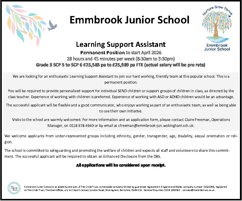 We are currently recruiting for a permanent Learning Support Assistant. Please see below for the advert.